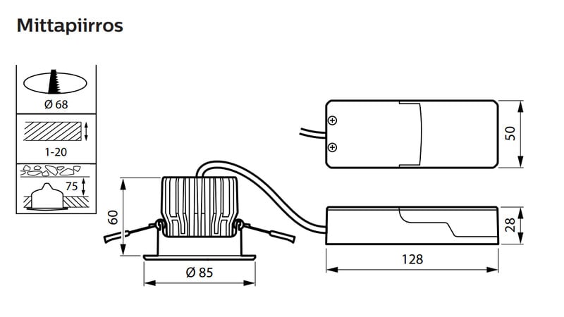 - Asennusaukon halkaisija: 68 mm