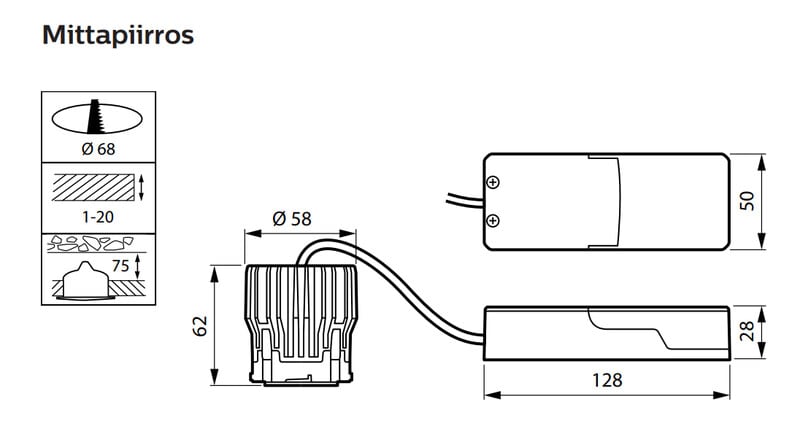 - Asennusaukon halkaisija: 68 mm