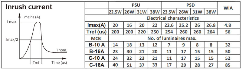 Enimmäismäärä valaisimia, johdonsuojakatkaisija C16: