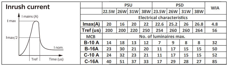 Enimmäismäärä valaisimia, johdonsuojakatkaisija C16: