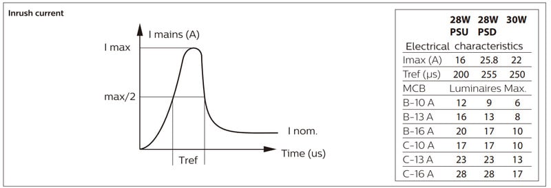 Enimmäismäärä valaisimia, johdonsuojakatkaisija C16: