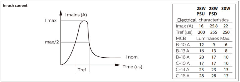 Enimmäismäärä valaisimia, johdonsuojakatkaisija C16: