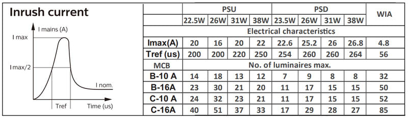 Enimmäismäärä valaisimia, johdonsuojakatkaisija C16: