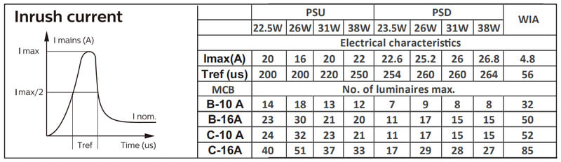 Enimmäismäärä valaisimia, johdonsuojakatkaisija C16: