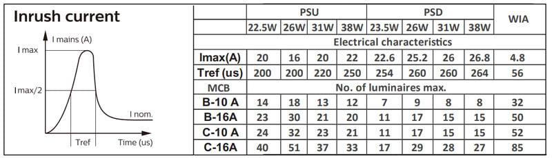 Enimmäismäärä valaisimia, johdonsuojakatkaisija C16: