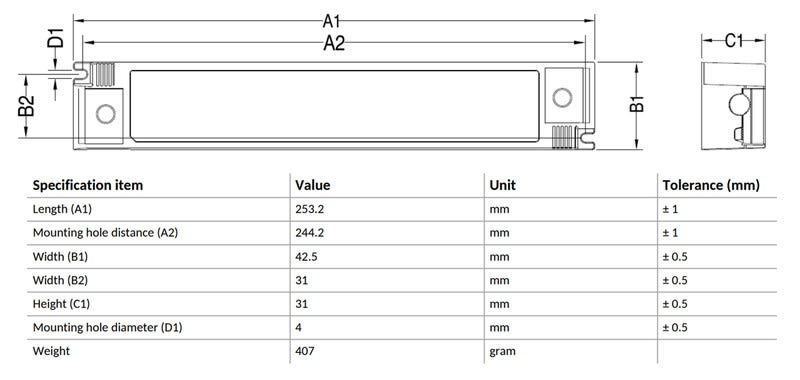 - Mitat (pituus x korkeus x leveys): 253 x 31 x 43 mm