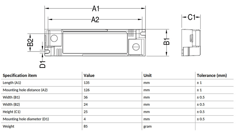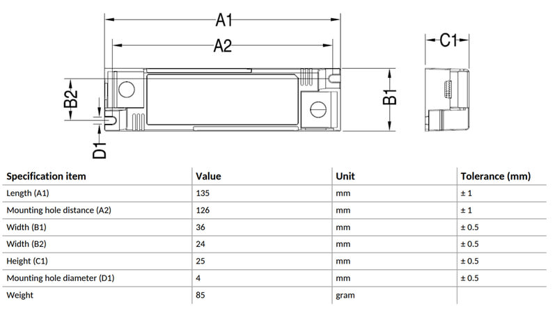 - Mitat (pituus x korkeus x leveys): 135 x 25 x 36 mm