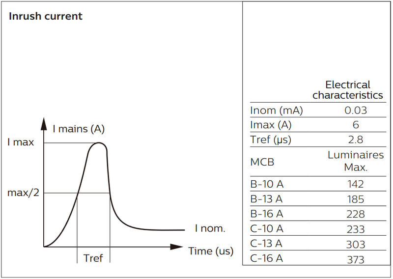 Enimmäismäärä valaisimia, johdonsuojakatkaisija C16: