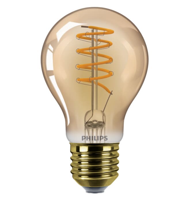 Philips MAS VLE LEDBulb sisustuslamppu D4-25W E27 A60 GOLD SP G.Valovirta 250lm, teho 4-25W, värilämpötila 1800K, himmennettävä, värintoistoindeksi Ra 80, kanta E27, kupu A60. Käyttö: hotellit, ravintolat, kahvilat, julkiset tilat, aulat. Philips MASTER Value LEDBulb sisustuslamppu