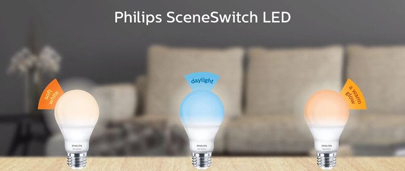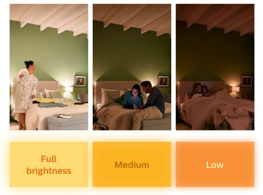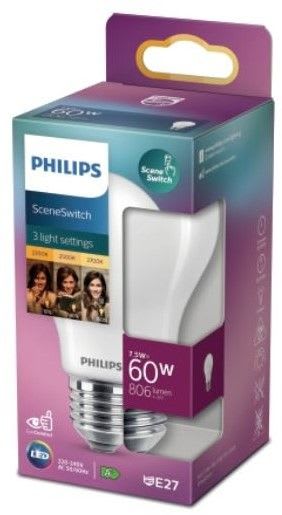 Philips LEDClassic SceneSwitch sisustuslamppu SSW 60W A60 E27 WW FRND1SRT4. Teho 7,5; 3; 1,6 W, värilämpötila 2 700 K, 2 500 K, 2200 K, valovirta 806-320-150 lm, käyttöikä 15 000h, värintoistoindeksi80. Kolme eri asetusta oikean tunnelman luomiseen. Philips LEDClassic Scene Switch sisustuslamppu