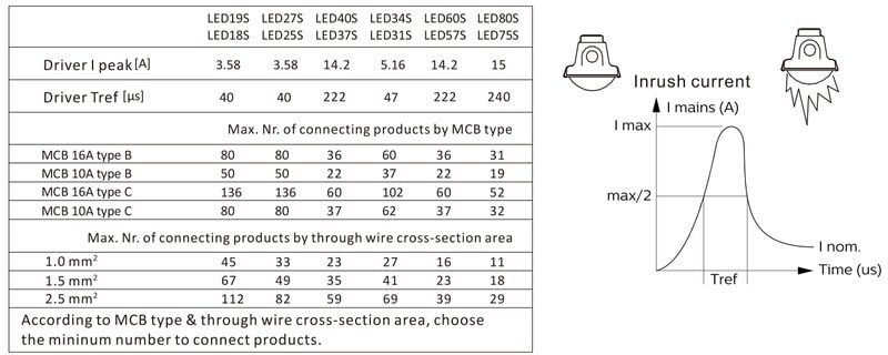Enimmäismäärä valaisimia, johdonsuojakatkaisija C16: