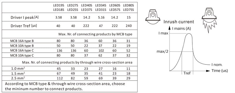 Enimmäismäärä valaisimia, johdonsuojakatkaisija C16: