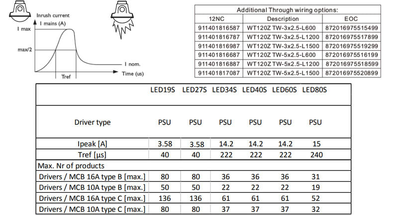 Enimmäismäärä valaisimia, johdonsuojakatkaisija C16: