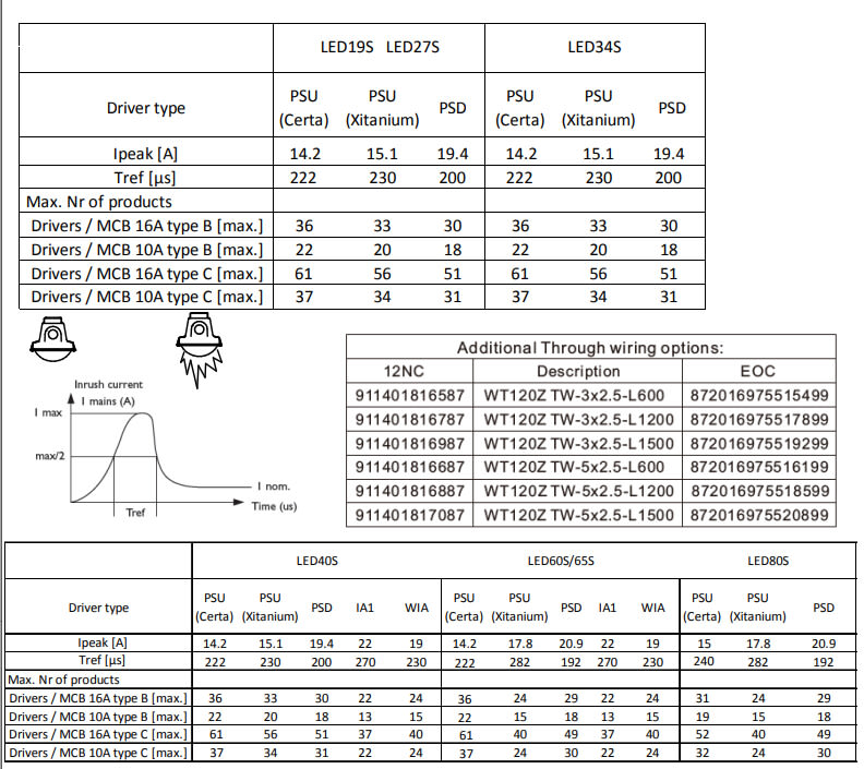 Enimmäismäärä valaisimia, johdonsuojakatkaisija C16: