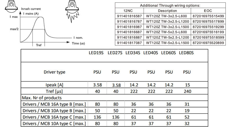 Enimmäismäärä valaisimia, johdonsuojakatkaisija C16:
