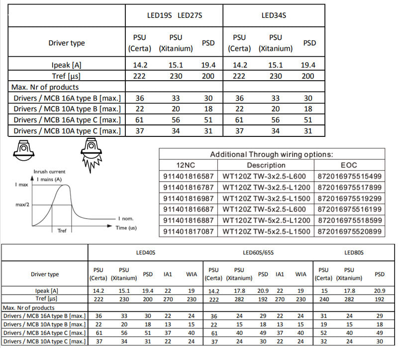 Enimmäismäärä valaisimia, johdonsuojakatkaisija C16: