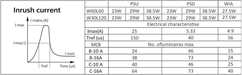 Enimmäismäärä valaisimia, johdonsuojakatkaisija C16:
