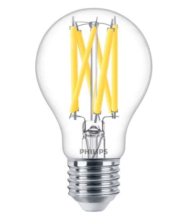 Philips MAS LEDBulb DT 10.5-100W E27 CRI95 A60 CL G. Valovirta 1521lm,teho 10,5W, korvaa 100W, värintoistoindeksi Ra95, vaihdettavavärilämpötila 2200/2700K, kanta E27, muoto A60, kirkas, lasi, elinikä25000h. Käyttökohteet: hotellit, ravintolat. Philips MASTER LEDBulb vakiolamppu