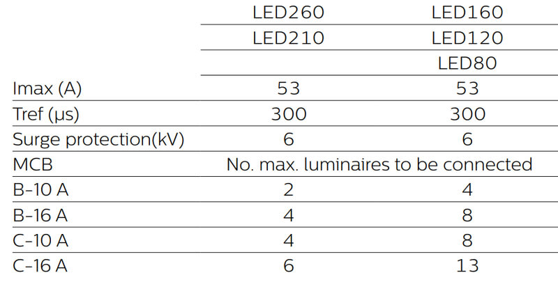 Enimmäismäärä valaisimia, johdonsuojakatkaisija C16: