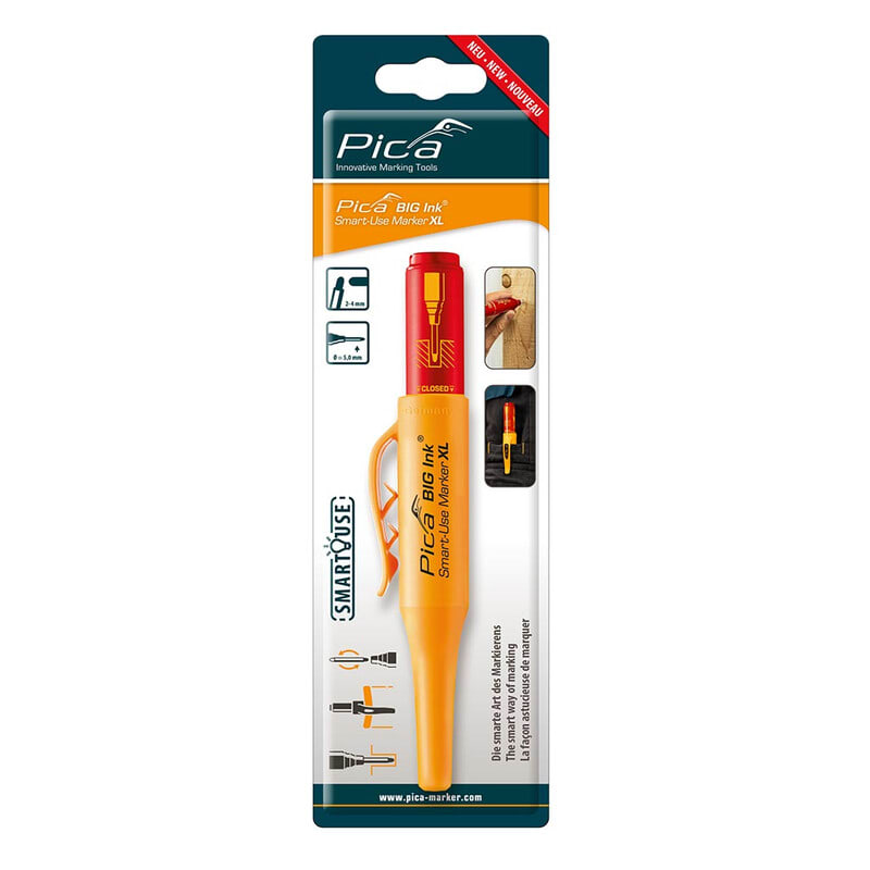 PICA BIG-Ink XL reikätussi, SB-pakkauksessa. Merkintäkynä ja reikätussi samassa. Vahvat ja näkyvät merkinnät erityisellä tarkkuudella, jopa Ø ≥ 5.0 mm porausreikien läpi. Sopii kaikille kiiltäville ja kuiville pinnoille, kuten lasi, metalli, muovi ja kartonki. Erittäin pehmeä ja tukeva kärki mahdollistaa erinomaisen musteen vapautuksen nopeaan ja kestävään merkintään ja tarjoaa ainutlaatuisen kirjoituskokemuksen. Innovatiivisen klipsin ansiosta tussi on aina käden ulottuvilla, missä tahansa oletkin. Tämä säästää arvokasta aikaa, koska mikään ei ole ärsyttävämpää kuin työkalun etsiminen. Nopea merkintä yhdellä kädellä, sillä klipsi pysyy aina housuissa, joten toinen käsi pysyy vapaana pitämään työkappaletta. Käännettävä kärki eliniän pidentämiseksi. Tutkimukset ovat osoittaneet, että lähes 40% oletettavasti tyhjistä mustetusseista sisältää edelleen yli 70% mustetta. Tämä johtuu kynien tarpeettomasta ja ennenaikaisesta hävittämisestä virheellisen käytön jälkeen, kuten: 1. tussin jättäminen auki ilman korkkia liian pitkäksi aikaa - kärki kuivuu. 2. merkinnät märille tai likaisille pinnoille - musteen virtaus häiriintyy. Pica BIG Ink® on ratkaisu tähän ongelmaan, sillä kirjoituskärki voidaan kääntää kokonaan ympäri. Tämä mahdollistaa nopean elpymisen väärinkäytön jälkeen. Suuri XL-mustesäiliö voidaan käyttää edelleen loppuun. Ruostumattomasta teräksestä valmistettu putki kirjoituskärjen ympärillä varmistaa puhtaat sormet. Tämä säästää ympäristöä ja budjettia. SB-pakkauksessa.
