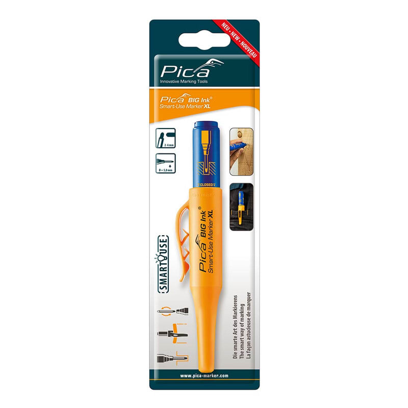 PICA BIG-Ink XL reikätussi, SB-pakkauksessa. Merkintäkynä ja reikätussi samassa. Vahvat ja näkyvät merkinnät erityisellä tarkkuudella, jopa Ø ≥ 5.0 mm porausreikien läpi. Sopii kaikille kiiltäville ja kuiville pinnoille, kuten lasi, metalli, muovi ja kartonki. Erittäin pehmeä ja tukeva kärki mahdollistaa erinomaisen musteen vapautuksen nopeaan ja kestävään merkintään ja tarjoaa ainutlaatuisen kirjoituskokemuksen. Innovatiivisen klipsin ansiosta tussi on aina käden ulottuvilla, missä tahansa oletkin. Tämä säästää arvokasta aikaa, koska mikään ei ole ärsyttävämpää kuin työkalun etsiminen. Nopea merkintä yhdellä kädellä, sillä klipsi pysyy aina housuissa, joten toinen käsi pysyy vapaana pitämään työkappaletta. Käännettävä kärki eliniän pidentämiseksi. Tutkimukset ovat osoittaneet, että lähes 40% oletettavasti tyhjistä mustetusseista sisältää edelleen yli 70% mustetta. Tämä johtuu kynien tarpeettomasta ja ennenaikaisesta hävittämisestä virheellisen käytön jälkeen, kuten: 1. tussin jättäminen auki ilman korkkia liian pitkäksi aikaa - kärki kuivuu. 2. merkinnät märille tai likaisille pinnoille - musteen virtaus häiriintyy. Pica BIG Ink® on ratkaisu tähän ongelmaan, sillä kirjoituskärki voidaan kääntää kokonaan ympäri. Tämä mahdollistaa nopean elpymisen väärinkäytön jälkeen. Suuri XL-mustesäiliö voidaan käyttää edelleen loppuun. Ruostumattomasta teräksestä valmistettu putki kirjoituskärjen ympärillä varmistaa puhtaat sormet. Tämä säästää ympäristöä ja budjettia. SB-pakkauksessa.