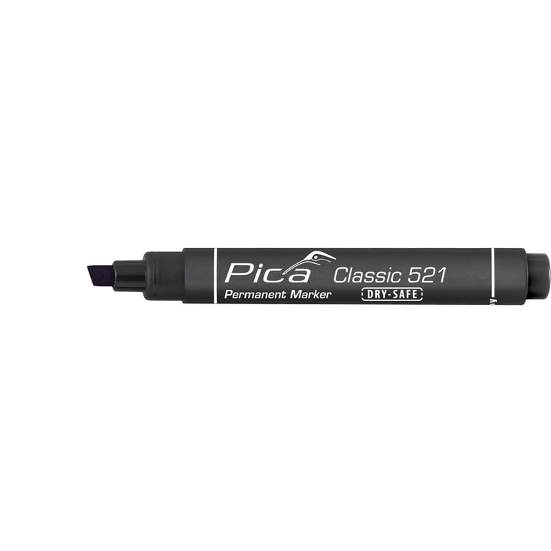 PICA huopakynä musta Classic 521, viistokärkinen SB. Permanenttikynä melkein kaikille pinnoille. Alkoholipohjainen vedenkestävä huopakynä. Soveltuu hyvin kiiltäville ja huokoisille pinnoille, kuten metallille, tiilille, kumille, puulle, lasille, kaakelille. Nopeasti kuivuva muste, pysyvä jälki noin 10 sekunnissa. Ei sisällä tolueenia tai ksyleeniä. Kynä kestää kuivumatta jopa 14pv ilman korkkia. Kärjen koko 2-6mm. SB-pakattu.