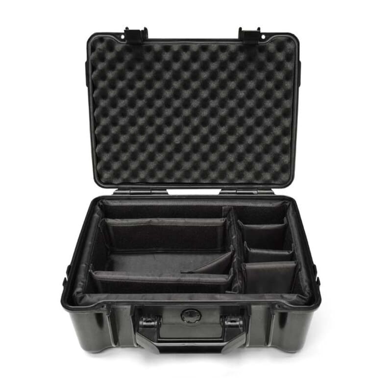 Kovaan käyttöön tarkoitettu kuljetuskotelo, jossa on kantokahva ja säilytyslokero pienille lisävarusteille.