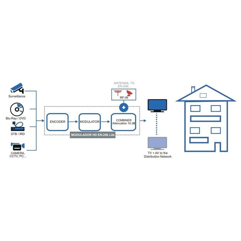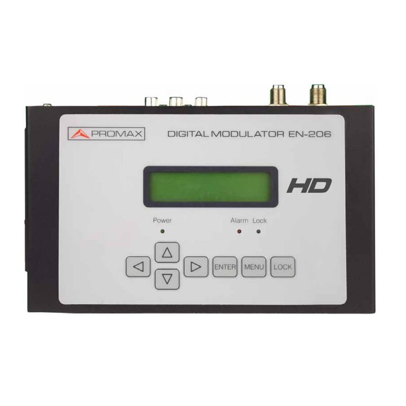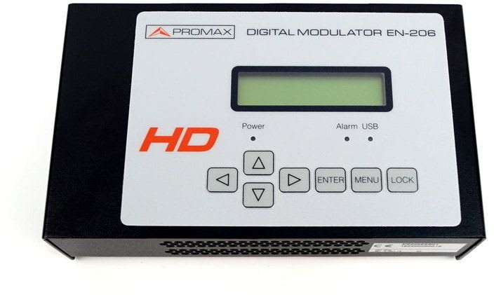 DVB-T MPEG4 digimodulaattori HDMI/CVBS, 142-964MHz, 114dBµV out Promax EN-206 Lite on digitaalinen HD-modulaattori joka muuntaa HDMI-videosignaalin DVB-T signaaliksi. Suosittu laite info-tv-signaalin muuntamiseksi omaksi kanavaksi kiinteistön antenniverkkoon.Lähtökanava on säädettävissä 174-862 MHz (VHF / UHF).