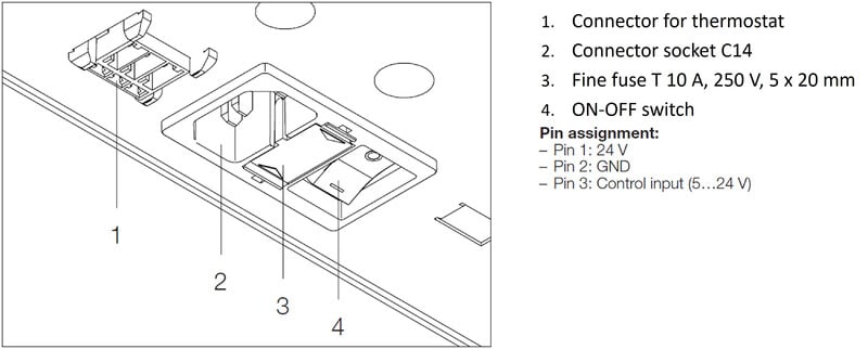 Virransyöttö C13-liittimen avulla. Toimitus ei sisällä virtajohtoa.