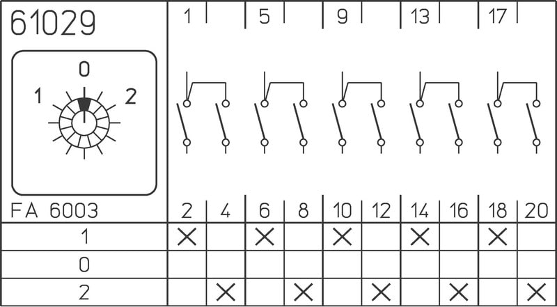 Nokkakytkin 1-0-2 5-napainen 10 kosketinta 20A kiinnitys kanteenkeskiöreikäänhalkaisija 22,5mm Nokkakytkin 1-0-2 5-napainen 10 kosketinta 20A kiinnitys kanteen keskiöreikään Ø22,5mm, etulevyn mitat 48 x 48 mm