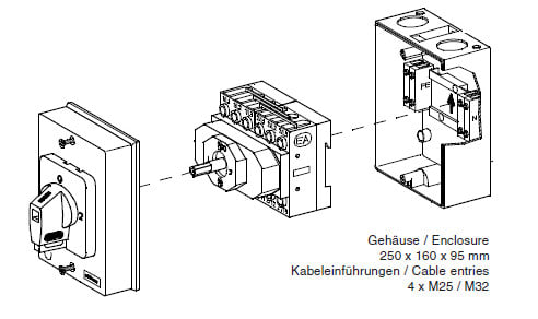 Koteloitu vaihtokytkin asennettavaksi pinta-asennukseen sisä- ja ulkotiloissa. Tuote soveltuu käytettäväksi verkonvaihtokytkimenä agrigaattien tai vastaavien varavoimalaitteiden liittämiseksi kiinteistöasennukseen sähköverkon jakelun katkostilanteissa tai kahden erilliskuorman sähkösyöttöön vuorotteluun. Tuote toimitetaan ilman holkkitiivisteitä. Ulkoasennuksessa suosittelemme käytettäväksi tuulettavia holkkitiivisteitä.
