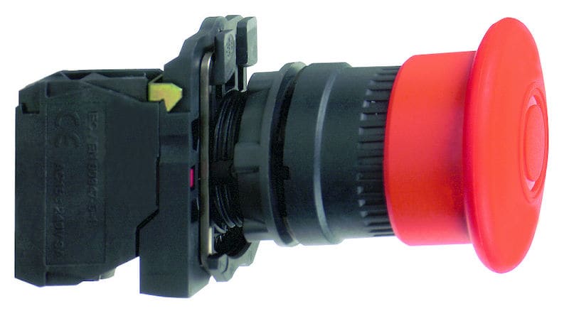 - Sienipainikkeet hätäpysäytykseen tai hätäkatkaisuun, kiertämällä , avaimella tai vetämällä vapautus , Ø 30, 40, 60 mm