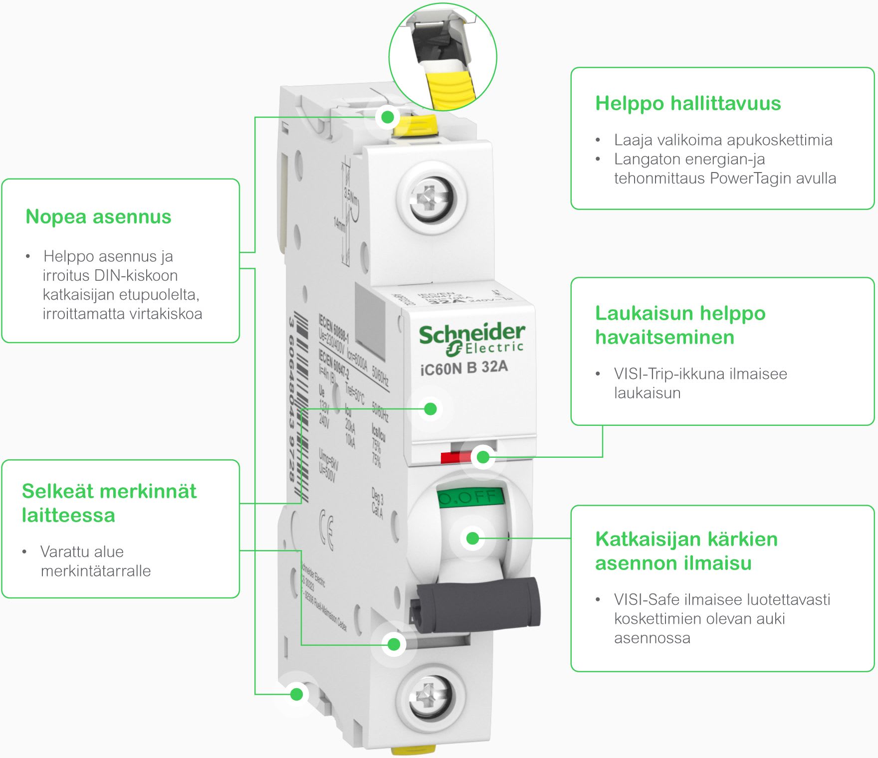 DIN-kiskoon asennettava johdonsuojakatkasisija (MCB) Acti 9 iC60 parantaa ainutlaatuisten ominaisuuksiensa ansiosta turvallisuutta ja käytön jatkuvuutta.