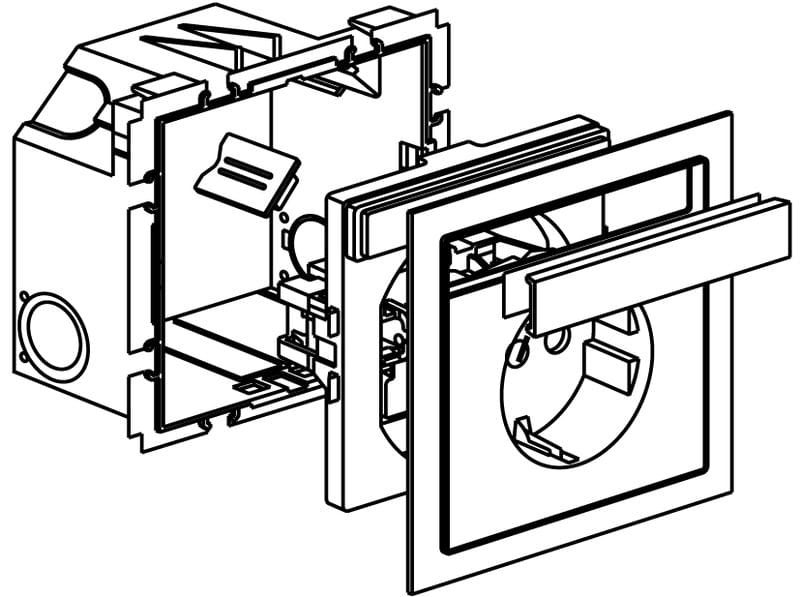 Pistorasiapakkaus koostuu kojerasiasta, kojeesta, kahdesta vedonpoistimesta, kannesta sekä etiketistä ja etiketti-ikkunasta. Kojeessa on jousiliittimet ja turvasulut