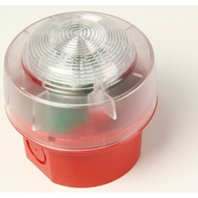 Konventionaalinen vilkku IP65, sisätiloihin seinälle tai kattoon asennettava,EN54-23 mukainen, hälyttimen väri punainen, vilkun valon väri punainen, linssin väri valkoinen, sisältää syvän asennusrasian (IP65), ei sisällä kaapelin läpivientiholkkeja
