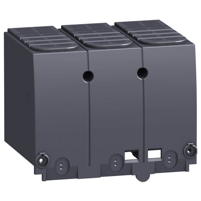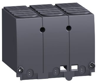 LV432593 -kompaktikatkaisija. Kosketussuoja 3P pitkä 1 kpl. Pitkäliitinten suojus. Napojen tyyppi 3P. Nimellisvirta 0 - 630 A. Liittimenpinnien väli 45mm