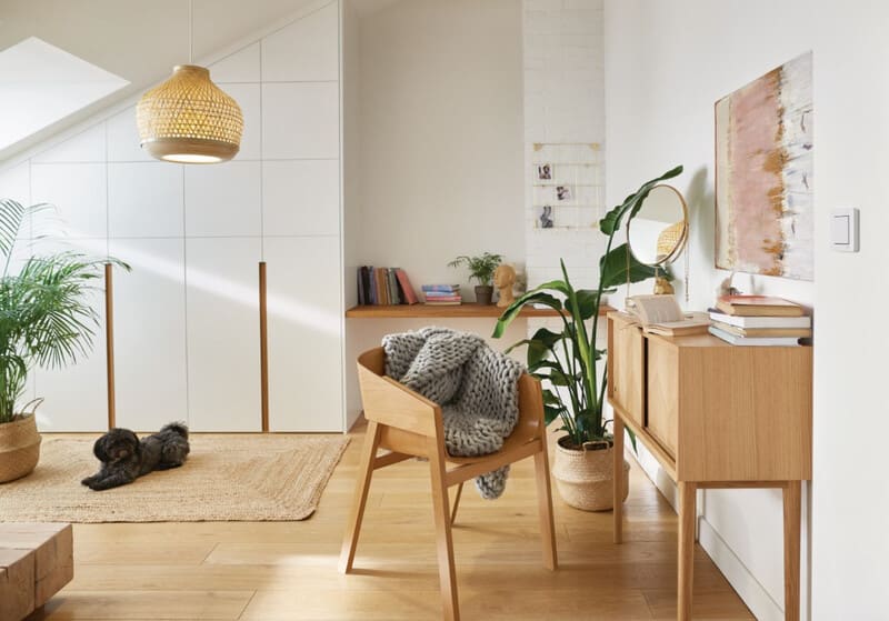 Langattomalla, paristokäyttöisellä Wiser-painikkeella ohjaat järjestelmän automaatioita ja esiasennettuja tilanteita näppärästi. Painike on kätevä myös ulko-oven viereen, jolloin Kotona/Poissa kotoa -tilanteiden hallinta on helppoa.