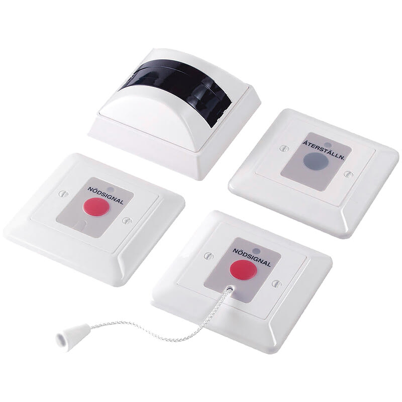Järjestelmään kuuluu muistiyksiköllä ja hälytinreleellä varustettu huonemerkkivalo, LED-merkkivalolla varustetut kutsupainikkeet 2kpl ja palautuspainike