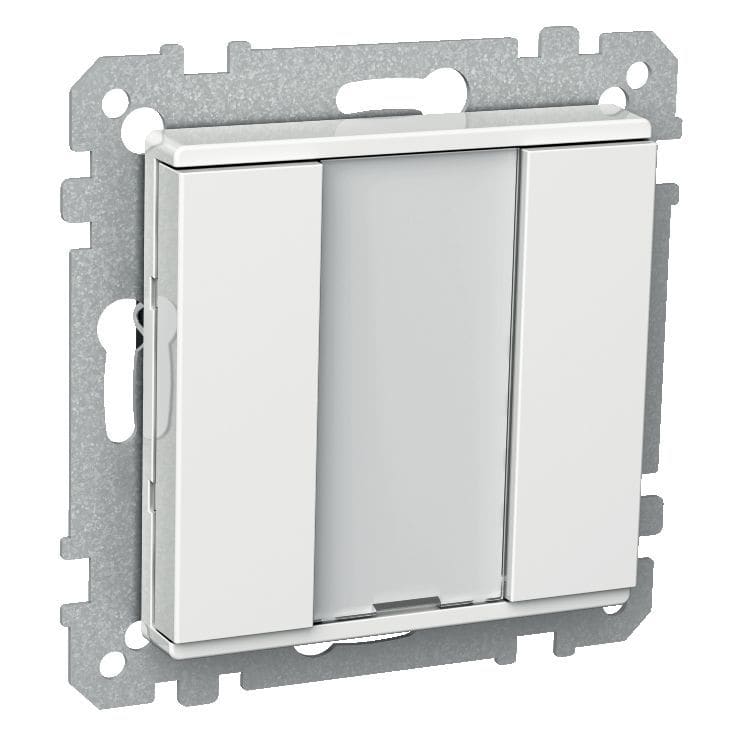 Painike 2 painikkeella ja merkintäikkunalla. Punainen painikekohtainen LED-merkkivalo ja yksi vihreä toiminnan ilmaiseva LED-merkkivalo. Ohjelmallinen KNX-toiminnallisuus: