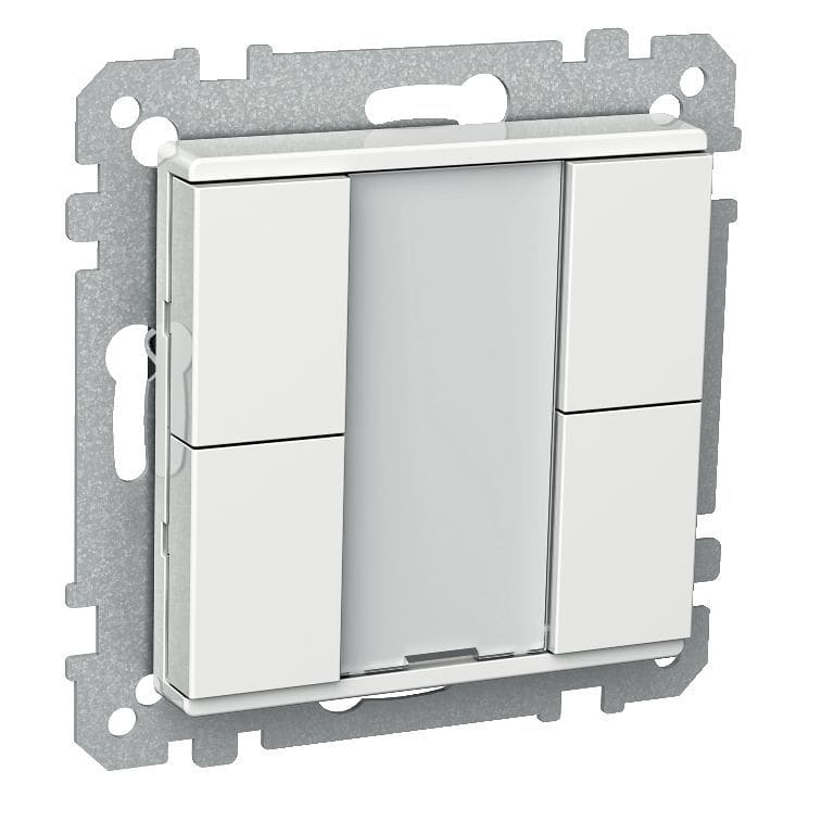 KNX-painike 4 painikkeella ja merkintäikkunalla. Punainen painikekohtainen LED-merkkivalo ja yksi vihreä toiminnan ilmaiseva LED-merkkivalo. Ohjelmallinen KNX-toiminnallisuus: