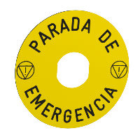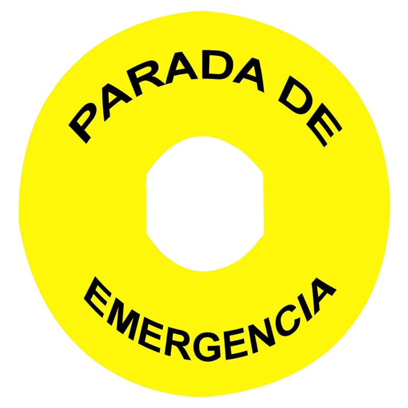 Hätä-seis kilpi, Harmony XB4/5, keltainen muovi, Ø90 mm, musta kaiverrus "PARADA DE EMERGENCIA" ja EN/ISO 13850 symboli Merkintäkilvet