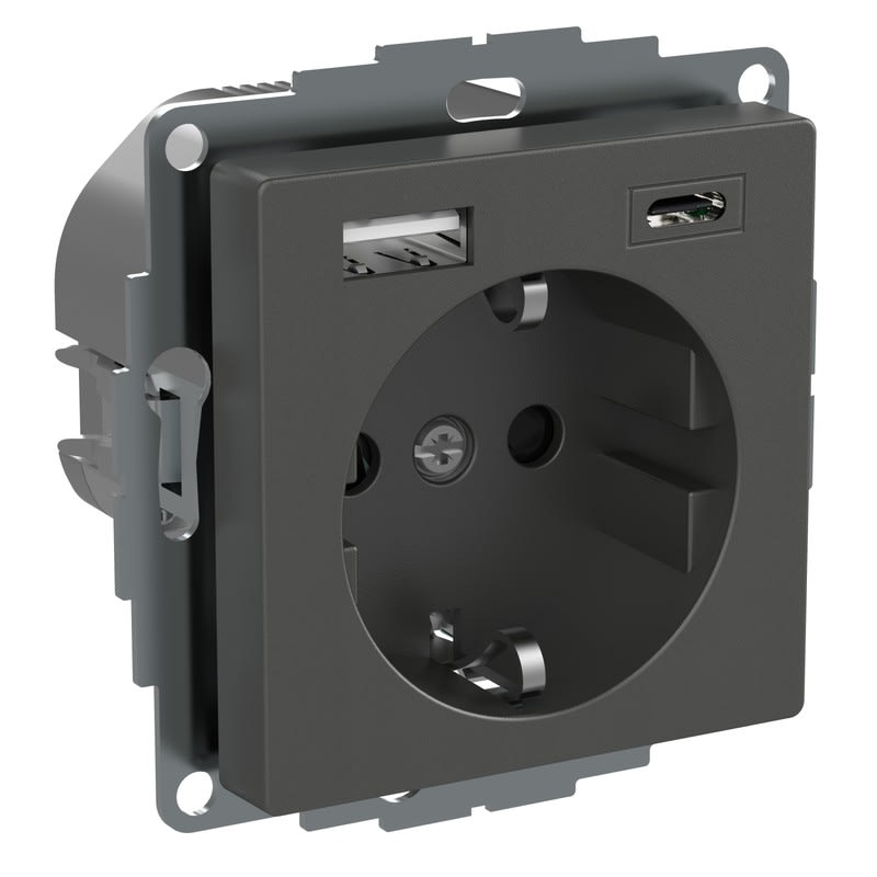 Monikäyttöinen 1-pistorasia nyt USB A + C liittimillä varustettuna. C-tyypin liittimeen voi asentaa liitosjohdon kummin päin tahansa. USB C -tyypin liitosjohdot yleistyvät nopeasti, Schneider Electric USB A+C tuotteen valitsemalla varmistat kalusteiden pysymisen ajanmukaisena vielä pitkään.
