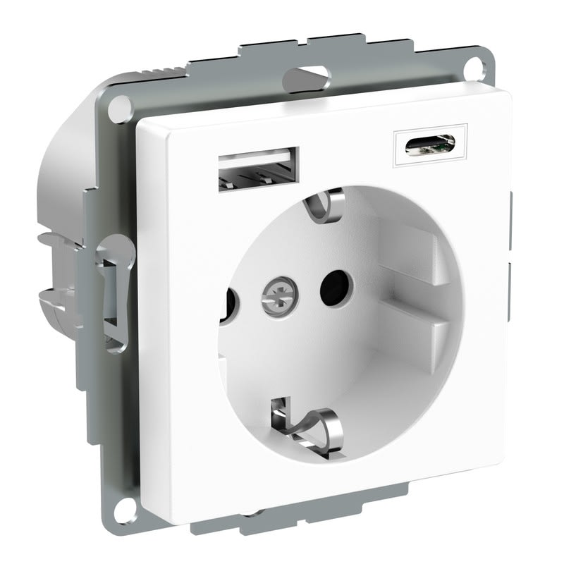 Monikäyttöinen 1-pistorasia nyt USB A + C liittimillä varustettuna. C-tyypin liittimeen voi asentaa liitosjohdon kummin päin tahansa. USB C -tyypin liitosjohdot yleistyvät nopeasti, Schneider Electric USB A+C tuotteen valitsemalla varmistat kalusteiden pysymisen ajanmukaisena vielä pitkään.