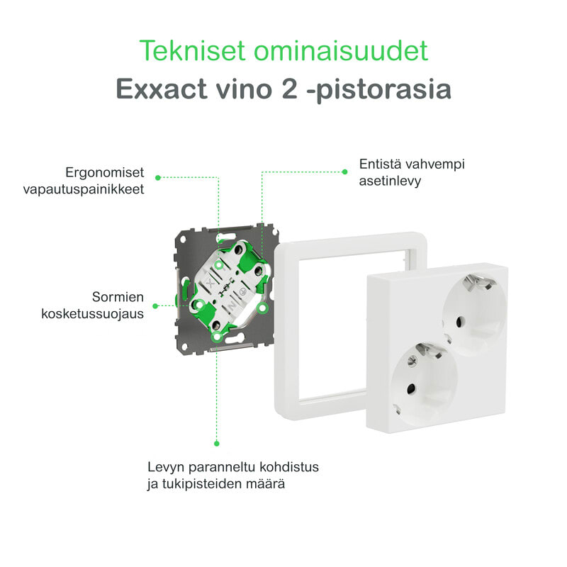 Exxact pistorasia 2-osainen IP21 vino jousiliitos valkoinen Uudistettu Exxact vino 2-pistorasia on suunniteltu yhteistyössä asiakkaiden kanssa. Pistorasian toimintaa ja rakennetta on paranneltu lukuisilla eri tavoilla. Uusi tuote on turvallisempi ja kestävämpi: