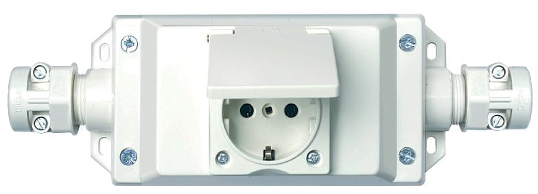 Pistorasiat toimitetaan holkkitiivistein, lisäksi rasian sisällä kiinnikkeet riippuasennusta varten. Ulkomitat 160 x 72 x 67 mm.