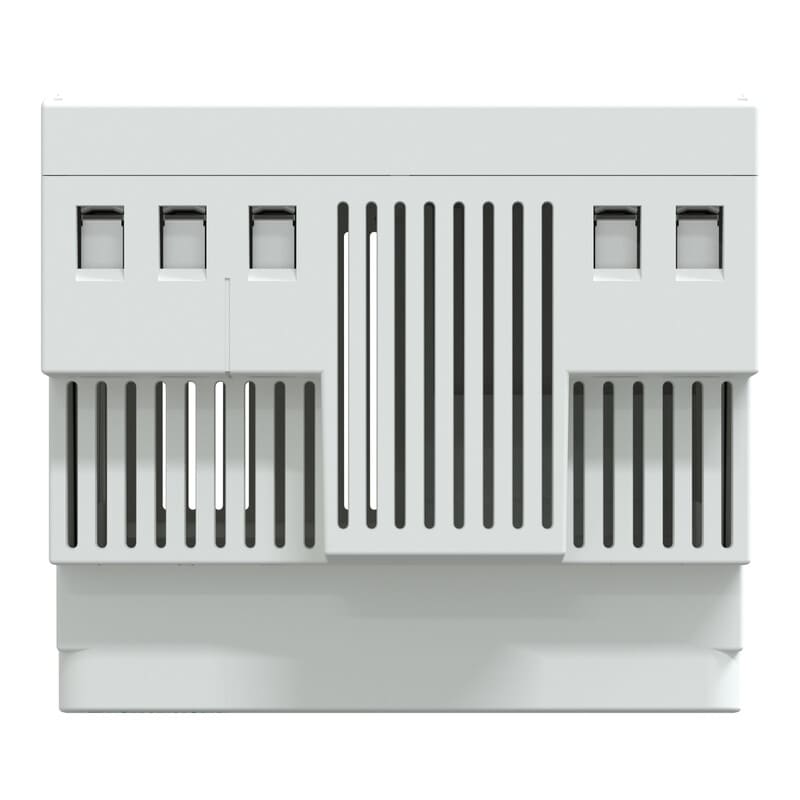 SpaceLogic KNX -keskuslaitteet vievät DIN-kiskolta 4 moduulipaikkaa (leveys noin 72mm).