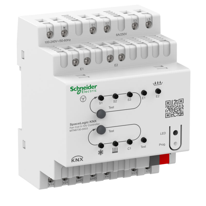 The SpaceLogic KNX Fan Coil 0-10 V Controller is used for controlling the fan coils for the air conditioning of rooms.