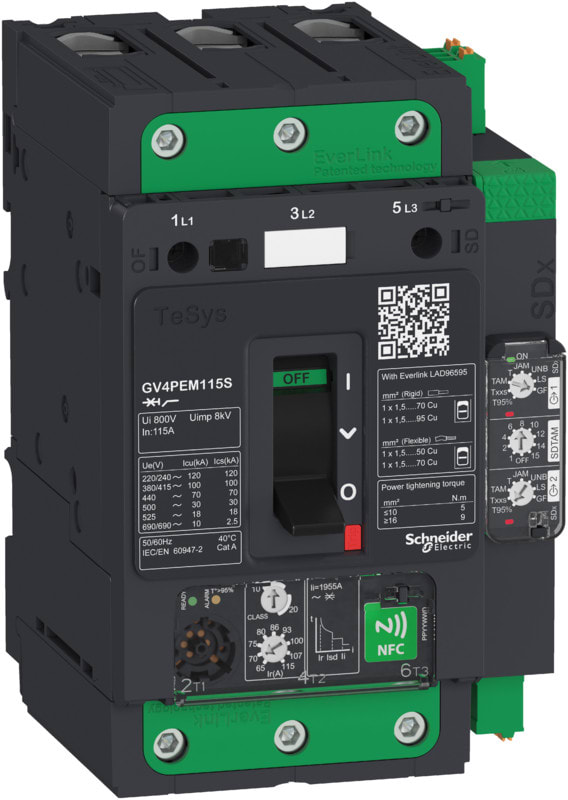 • GV4PEM: Oikosulku- ja ylikuormitussuojaus laajennetuilla suojauksilla (jumisuojaus, maavika, vaihe-epäsymmetria, ylipitkät käynnistykset) ja mahdollisuuden SDx vianerottelumoduulin käyttöön
