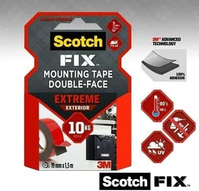 Scotch-Fix™ Extreme Exterior kiinnitysteippi, jossa on 3M™:n kehittynyt teknologia. Tämä korkealaatuinen, mukautuva teippi kestää jopa 10 kg painon. Se on tarkoitettu vaativaan ulkokäyttöön ja on ihanteellinen maalatulle kipsilevylle, maalatulle/viimeistellylle puulle, metallille, akryylille, tasaiselle kivelle ja maalatulle betonille.