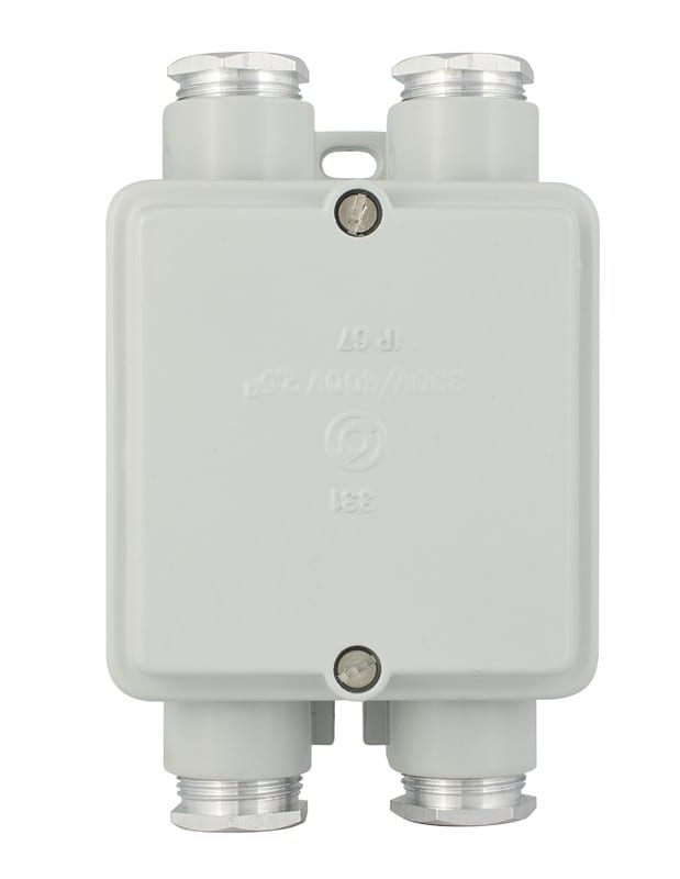 4x2,5 mm2 vaippaliittimet + maadoitusliitin. Rasioissa 1 kpl sisäpuolinen vedonpoistin. PK16 läpiv. Alumiiniset holkkitiivisteet. 83x88 mm. Saatavana myös pohjareiällä.